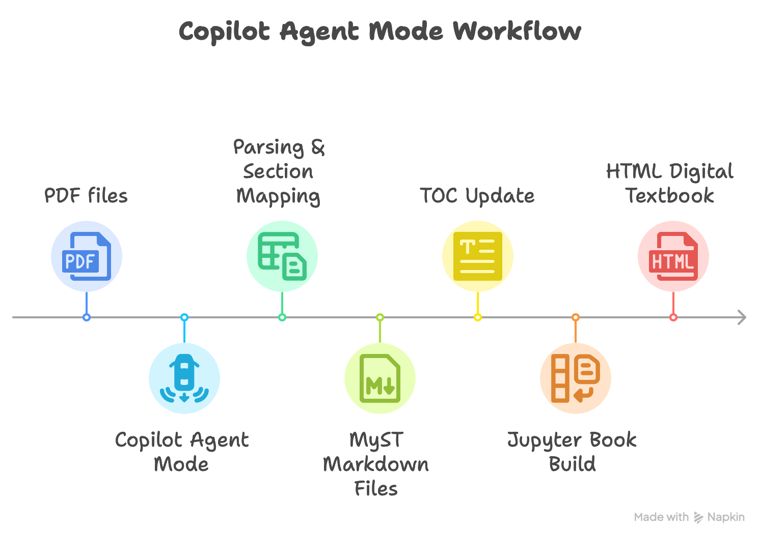 All changes are tracked in git, making it easy to review, revert, or collaborate on textbook content. By integrating with GitHub MCP (Model Context Protocol) servers, the pipeline enables seamless version control and collaboration. This means every edit, addition, or deletion is recorded, and you can easily roll back to previous versions, manage pull requests, and coordinate with contributors—all within your automated workflow. MCP servers also allow the agent to automate common git operations, such as committing changes, syncing branches, and handling merge requests, further streamlining the review and publishing process.
